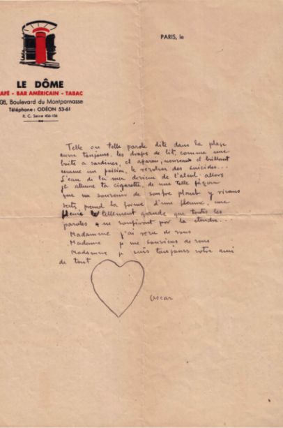 Muchas de estas cartas de Óscar Domínguez fueron redactadas durante su estancia en la capital francesa sobre papel de restaurantes y cafés parisinos con señas impresas de los establecimientos. Se trata, además de una delicada miniatura poética –de un exaltado texto en beneficio de una vida alcanzada a través del amor– , de un juego o puzzle que recompone el sentido del viaje de Óscar Domínguez por los vericuetos de la creación y la imaginación más desbordada. Estas cartas ofrecen un testimonio valiosísimo no sólo de la vida