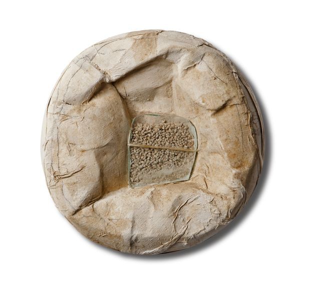 Técnica: Mixta con tela sobre cartón, arroz, cristal y lápiz.