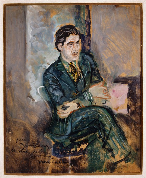 En el contexto del París de los años de la Ocupación y en la década de los años cuarenta, el grupo de los artistas de la "escuela de París" se relaciona con frecuencia y participa de las tertuliass y los cafés de artistas de la capital francesa. Es en ese ambiente de fraternidad y confidencias español en el que Grau Sala realiza este retrato de un Óscar Domínguez sentado en una silla y vestido con traje a rayas. La pintura participa del habitual estilo figurativo amable y colorista de Grau Sala. En ella destaca el dibujo de líneas que perfila y da carácter a la elegante personalidad del retratado. También llama la atención la dedicatoria "a Óscar Domínguez, mago de Tacoronte", en la que Grau hace un lúcido juego de palabras entre la procedencia vernácula del pintor canario y su condición de artista visionario o surrealista, a la manera de un mago que da a ver imágenes sorprendentes por su inventiva e impulso imaginativo.